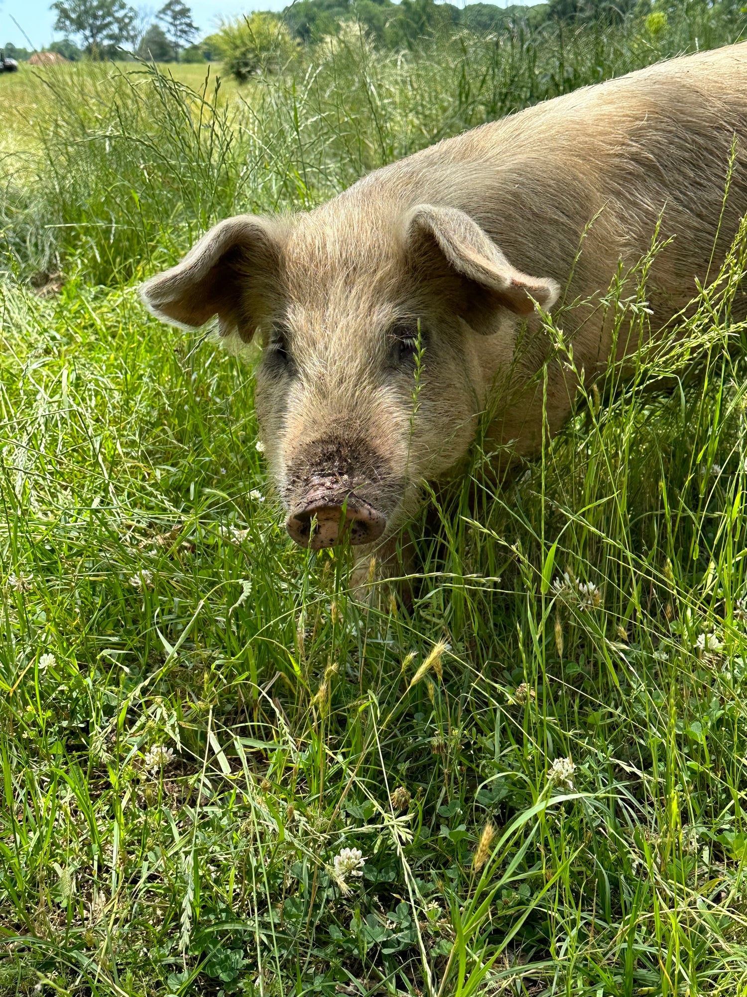 Farrow-to-finish, our pigs live on our farm from the day they are born until they are harvested. Depending on the time of year and trending heat index, our pigs are raised either on pasture or in the shade of the wooded areas of our property. Our pigs are free to root and forage for whatever interests them. However, unlike ruminants that have four-chambered stomachs and can digest more fibrous plant matter, pigs have a digestive tract that requires a feed ration to thrive and gain weight beyond what they can forage. We supplement a complete nutrition feed milled here locally in Mississippi. Heritage breed pigs raised outdoors in low stress environments produce meat with higher nutrients, more fat and better flavor.